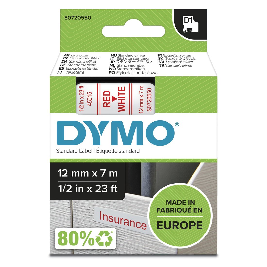 Dymo D1 nastro 12 mm x 7 m roso su bianco 45015
