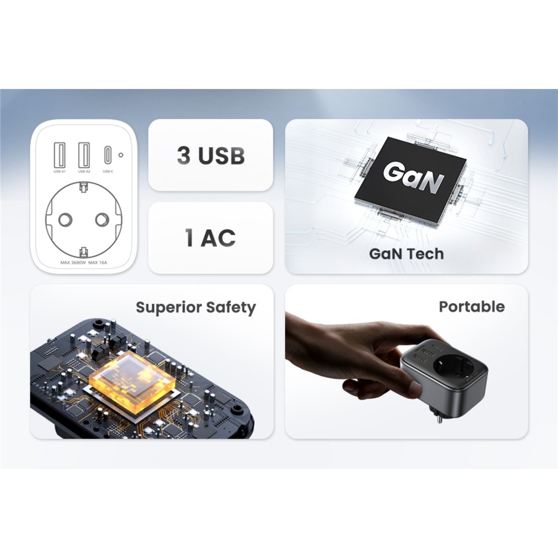 2x USB-A / 1x USB-C / 1x Schuko